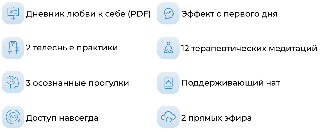 – Ты хочешь сделать отношения с собой теплыми и гармоничнымиА еще это отличный вариант, если у тебя мало времени или тебе сложно проходить длительные курсы самотерапии.